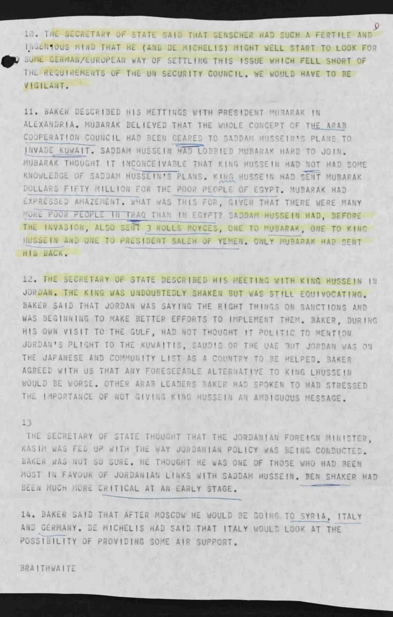 ١١ وعن اجتماعه بمبارك يقول ان مبارك قال انه يرى ان مجلس التعاون العربي صنعه #صدام_حسين ليكون غطاء لانتزاع كويت وان صدام عمل جاهدا على اقناعه للانضمام وانه غير مقتنع بعدم علم الملك حسين بدخول كويت