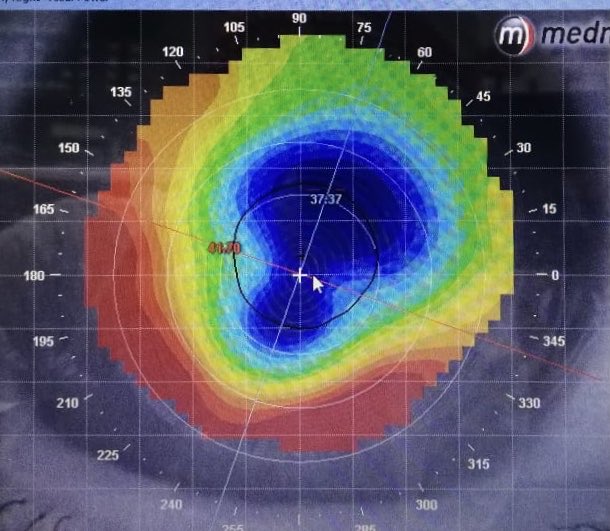 من عشر سنوات وبعد اكتشاف حالته انه قرنيه مخروطية متقدمه في كلتى العينين وخاصة العين اليمنى ، نصحه الجراح بزراعة قرنية باليمين وحلقات في العين اليسرى