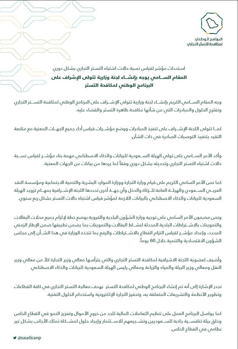 الأمر السامي الملكي والتنظيمات التي تمت منذ 2017 أعطت الأمل الكبير في إنتعاش الصدق التجاري والأمانة المالية وتضييق الخناق على كل فاسد فسد ويريد أن يفسد في حق هذا #الوطن #السعودية في مقدراته الوطنية الاقتصادية والعملية.🔵