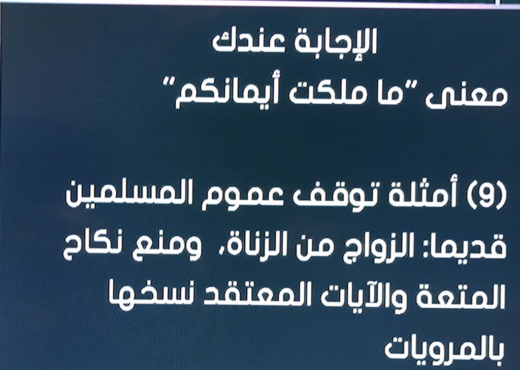 نستطيع تأويل الايةايضا ولكن المعنى المباشرلانقدر عليه.مثل آخرللتوقف عن النص نكاح المتعةمنصوص عليه ف القرآن ولكن هناك مرويات نسخته وفي النظرفامر هذاالزواج مهين للمراةوالرجل ويبتعدعن قدسيةالزواج بل هو اقرب للعلاقةالمحرمة.
