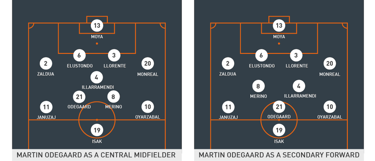 أوديغارد طور وظائفه و تحول خلال الموسم إلى لاعب خط وسط ثالث،ل10 صريح خلف المهاجم أو لجناح أيمن عكسي أو لمهاجم ثاني.تألق مع سوسيداد برسم 4-2-3-1، 2.4.4 و 3.3.4. جميع هاته الخطط سمحت له إما بالتوغل في الهجوم أو البقاء في الوسط و حرية التحرك في الثلث الأخير.