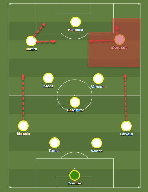 من المحتمل أن يستفيد زيدان من أفضل نسخة من موهبة اوديغارد إذا تم الإعتماد على تشكيلة 4-2-3-1،حيث يلعب النرويجي كرقم 10.لن يضطر النرويجي إلى القلق بشأن الواجبات الدفاعية بسبب وجود ثنائي إرتكاز دفاعي، كما أن فرص فالفيردي كبيرة في الظهور برسم 4-2-3-1