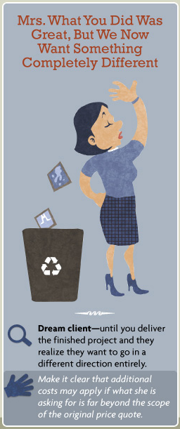 فيه فئة من العملاء بعد ما تتعب وتصمم لها، تجي وتقول ما عجبني تصميمك. عطني فكرة جديدة. طيب يابنت الحلال انتي وش الستايل اللي تبينه بالضبط؟ تقول ما اعرف. بس متأكدة إن التصميم اللي سويته ما يناسبني. لا إنت بتقدر تفهم لها ولا هي راح تقدر توصل لك اللي تبيه. لذا نصيحة لا تضيع وقتك معها