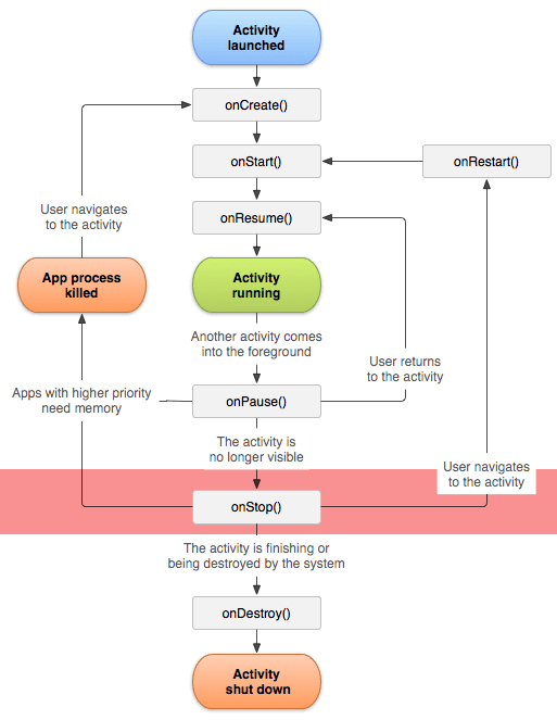 ملاحظة: هذه المراحل "Events" خاصة بكل Activity وليس التطبيق، يعني كل نافذة في التطبيق تمر بهذه المراحل، وأنت كمبرمج تقدر تتسفيد منها مثلا تبغى كود معين يتنفذ في مرحلة معينة تكتبه داخل الدالة المخصصة لها.