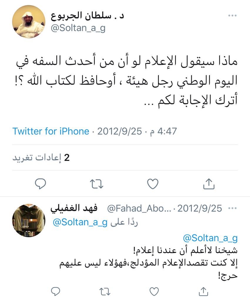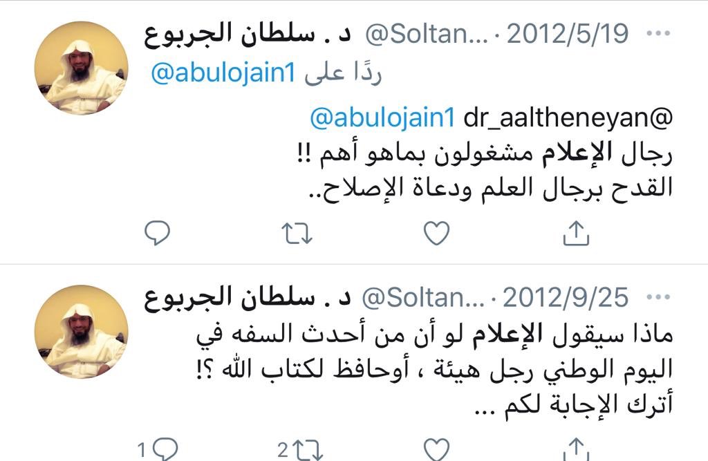 #الدكتور _سلطان_الجربوع رئيس قسم الدراسات الإسلامية من المدافعين عن شيخ التكفير #سليمان_العلوان ومن المتعاطفين معه والمستبشرين بخروجه من السجن وهو عنده العلامة الإمام!!!
