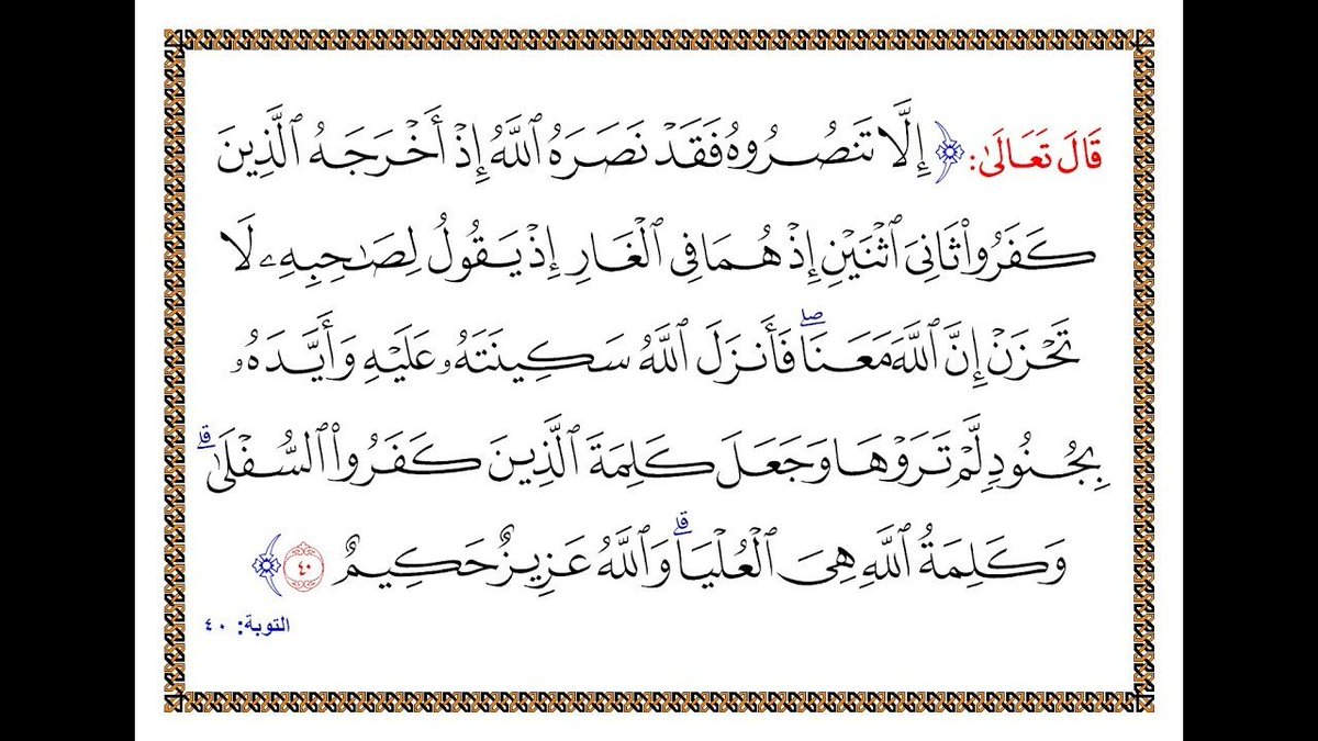 يَقُولُ لِصَاحِبِهِ لَا تَحْزَنْ إِنَّ اللَّهَ مَعَنَا فَأَنْزَلَ اللَّهُ سَكِينَتَهُ عَلَيْهِ وَأَيَّدَهُ بِجُنُودٍ لَمْ تَرَوْهَا وَجَعَلَ كَلِمَةَ الَّذِينَ كَفَرُوا السُّفْلَى وَكَلِمَةُ اللَّهِ هِيَ الْعُلْيَا وَاللَّهُ عَزِيزٌ حَكِيمٌ } [التوبة: 40] .