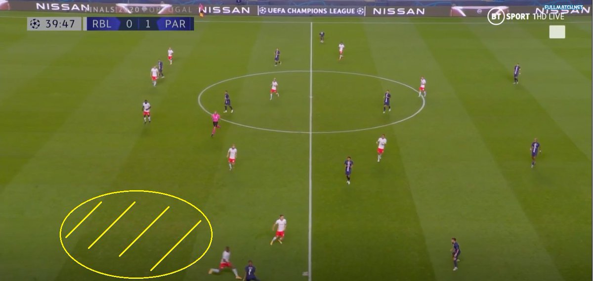 اما في مباراة لايبزغ مع الضعط العالي المتبع لـفريق نايغلزمان كانت خطة توخيل خلق الحرية مرة أخرى للوزير نيمار وخلق الفراغات له