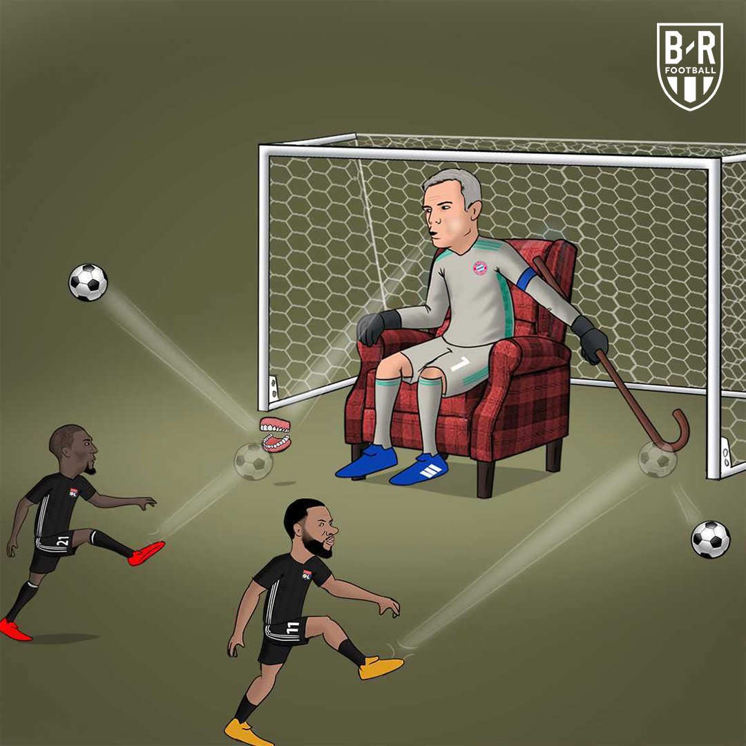 قبل الهدف الأول ضد ليون كانت هناك تسديدة على القائم لمرمى نوير،قبلها قائم لميسي في المباراة الماضية دقائق قبل قلب النتيجة. دفاعيا لم يختبر البايرن كفاية أمام هجوم سريع و مهاري و يغير المراكز و يلعب كرات مباشرة. أخطاء غطاها الفوز على ليون بثلاثية و تأديب برشلونة التاريخي ب8 أهداف