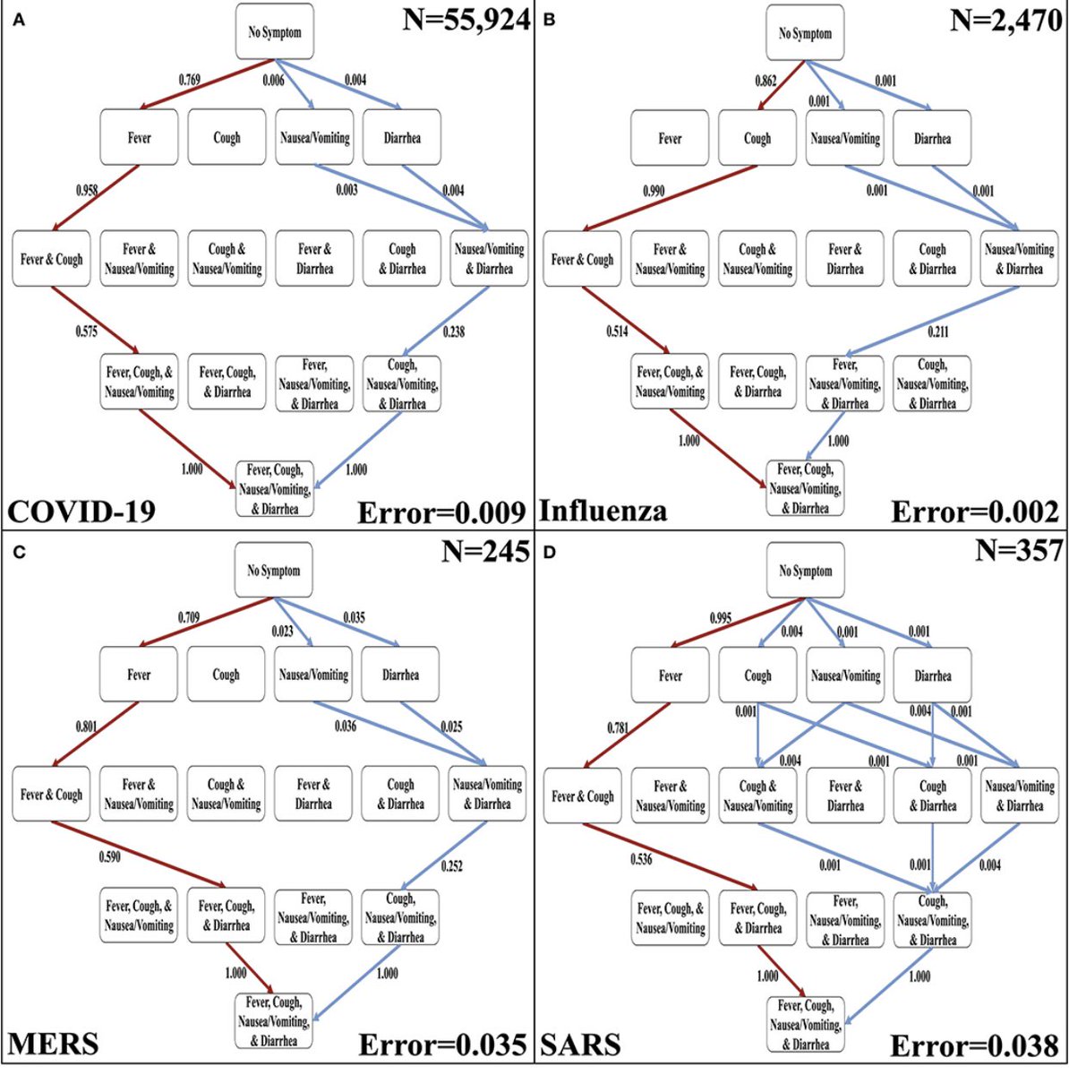 مثلما قلنا سابقا الانفلونزا والكوفيد١٩ يتشاركان بنفس الاعراض، لكن يوجد دراسة مثيرة للاهتمام تثبت انه قد يوجد هناك نمط في ترتيب ظهور الاعراض لكل مرض