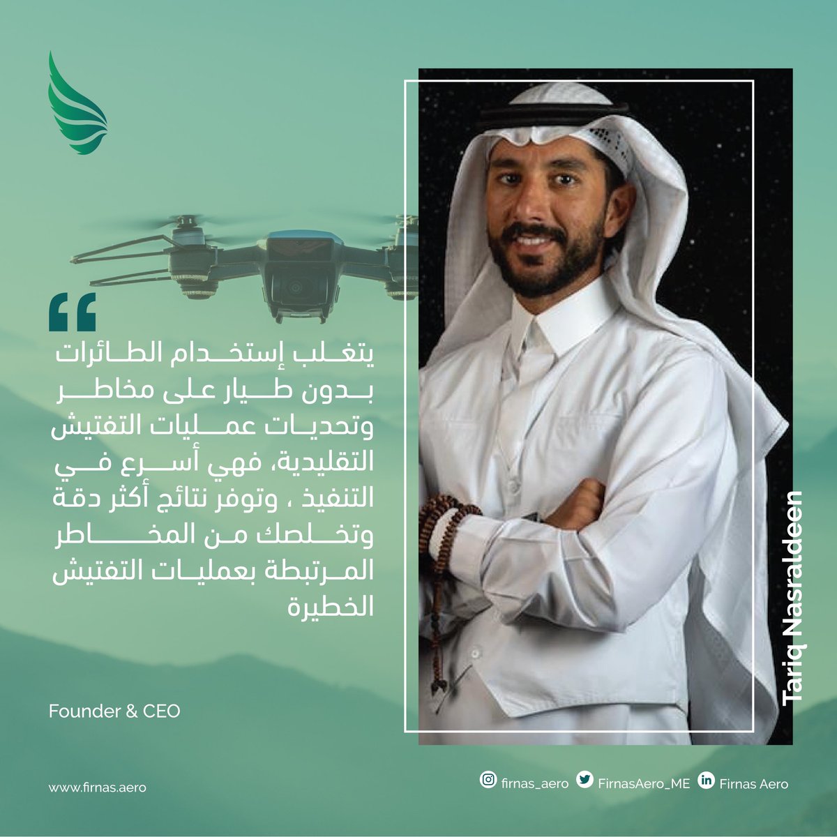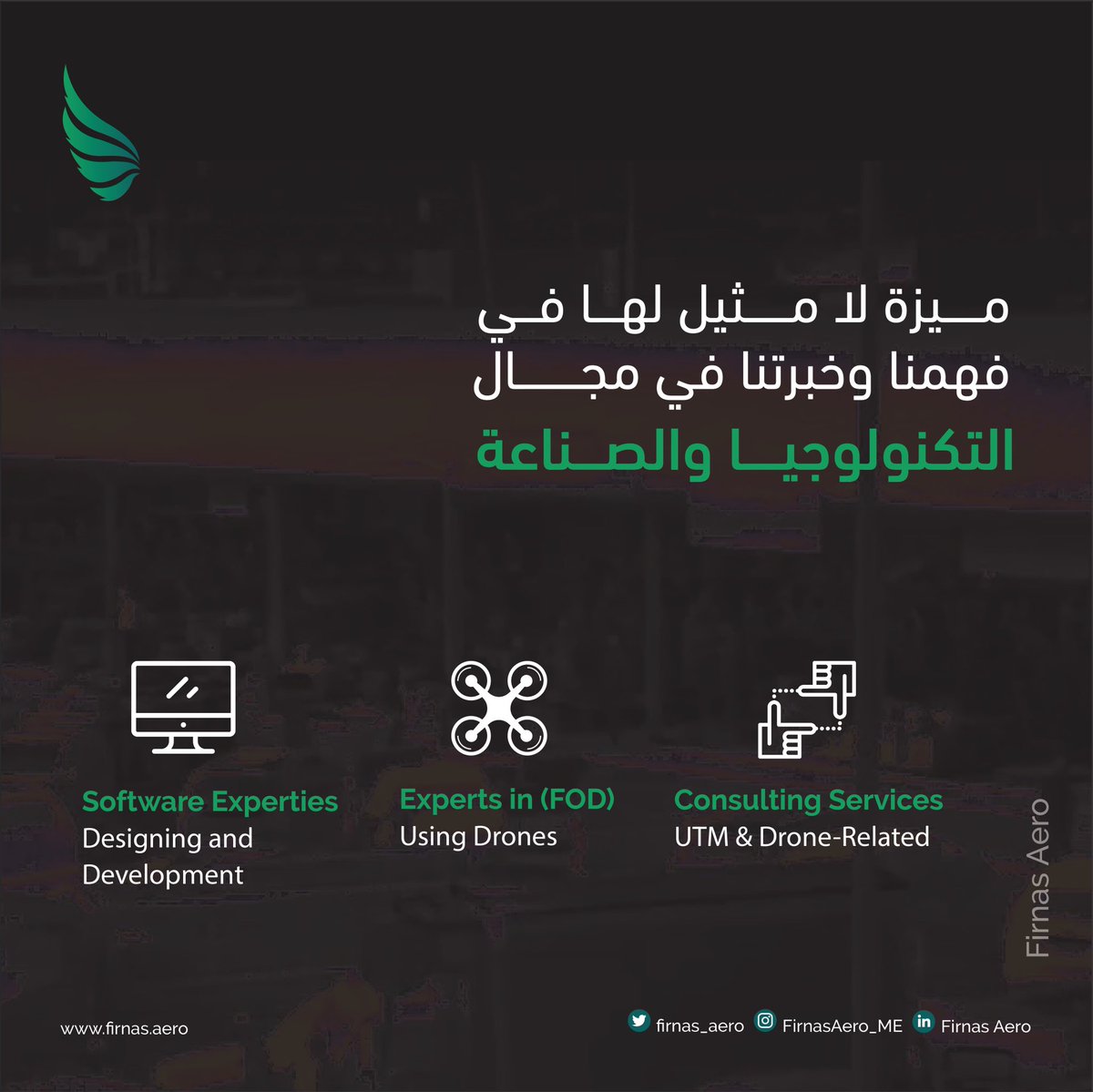 الشركة #السعودية الناشئة شركة فرناس إيرو @FirnasAero_ME تم تأسيسها وإحتضانها في مجمع التكنولوجيا في جامعة #كاوست السعودية وهي متخصصة في تقديم حلول مرنة ودقيقة ومتقدمة بإستخدام #الطائرات_بدون_طيار حيث طورت الشركة السعودية طائراتها بدون طيار وبرامج مجهزة بالذكاء الاصطناعي .