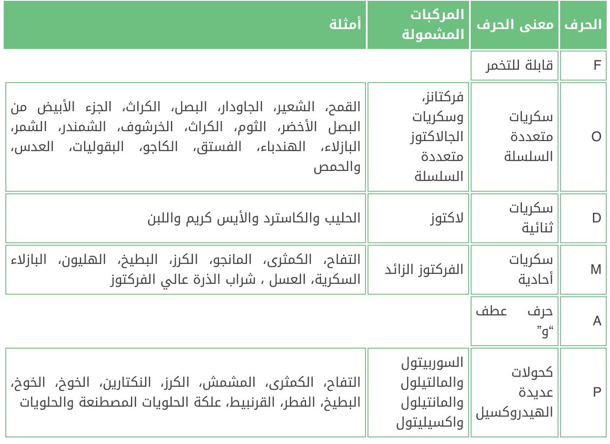 يدخل فيها الفركتوز وتوجد في القمح والبصل والثوم والبقوليات