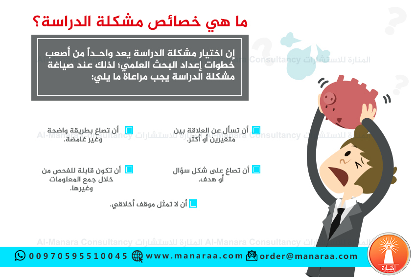 يجب أن تكون صياغة مشكلة الدراسة على هيئة سؤال أو هدف، أن تكون مشكلة الدراسة قابلة للفحص من خلال جمع المعلومات وغيرها، وأن لا تمثل مشكلة الدراسة موقفاً واتجاهاً أخلاقياً.