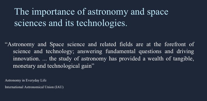 "علوم الفلك والفضاء والمجالات ذات الصلة في مقدمة العلوم والتكنولوجيا؛ وتجيب على الأسئلة الأساسية وتدفع الابتكار ... لقد وفرت دراسة علم الفلك ثروة من المكاسب الملموسة والنقدية والتكنولوجية".