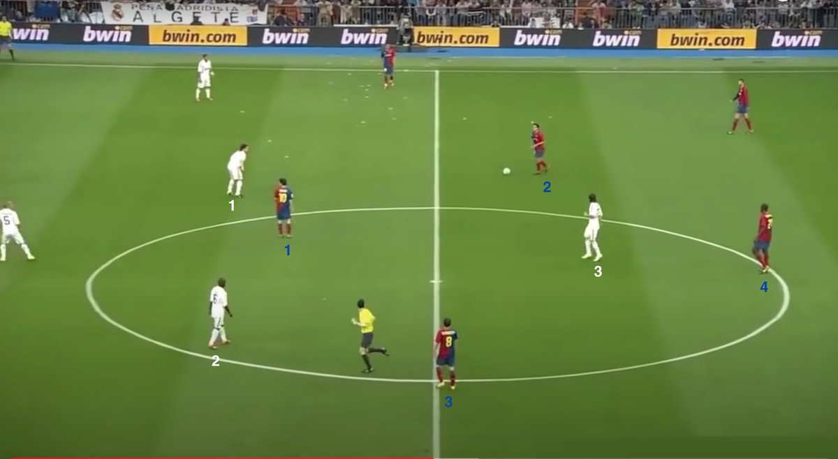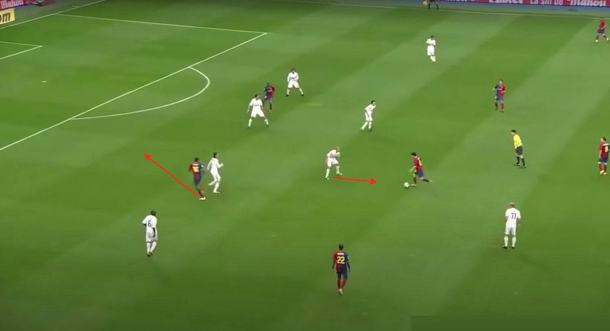 المهاجم التقليدي رقم٩ يكون كما وضحنا بين قلبي الدفاع منتظرا الكرة من الأجنحة لأحرزها في المرمى لكنه محاط بقلبي الدفاع الذين يغطون عليه يقوم أحد قلب الدفاع بالضغط عليه لإفتكاك الكرة والأخر يغطي ع المدافع الضاغط ع المهاجم حامل الكرة وبالتالي المهاجم التقليدي متصيد من قبل الدفاع..
