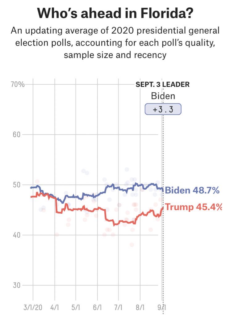 ذا اقل تقدم لبايدن ١.٨ بولاية فلوريدا منذ ١٩ ابريل.، تاريخيا ولاية فلوريدا صعب التنبأ بها لكن تقدم ترامب فيها بشكل هادئ له شهر واذا استمر الوضع بيوم الانتخابات قد نشهد تقدم ترامب فيها بثلاث نقاط او اربع وبهذا الفارق ارى ان ترامب سيفوز بالولايه