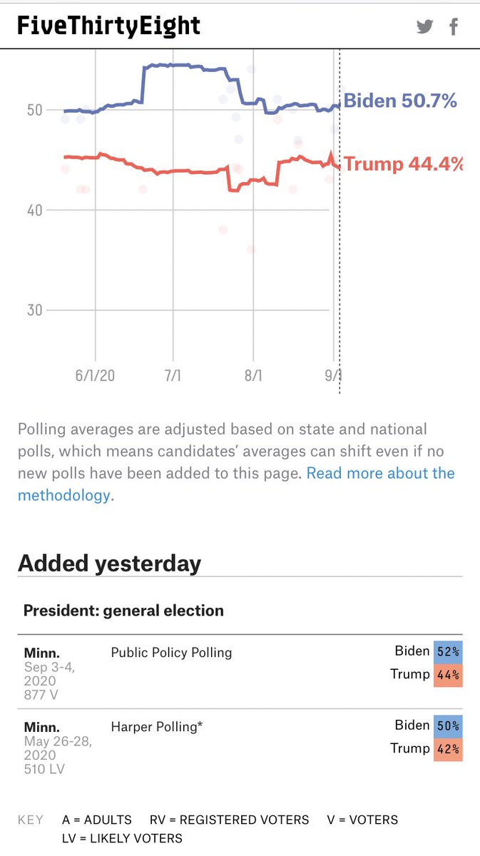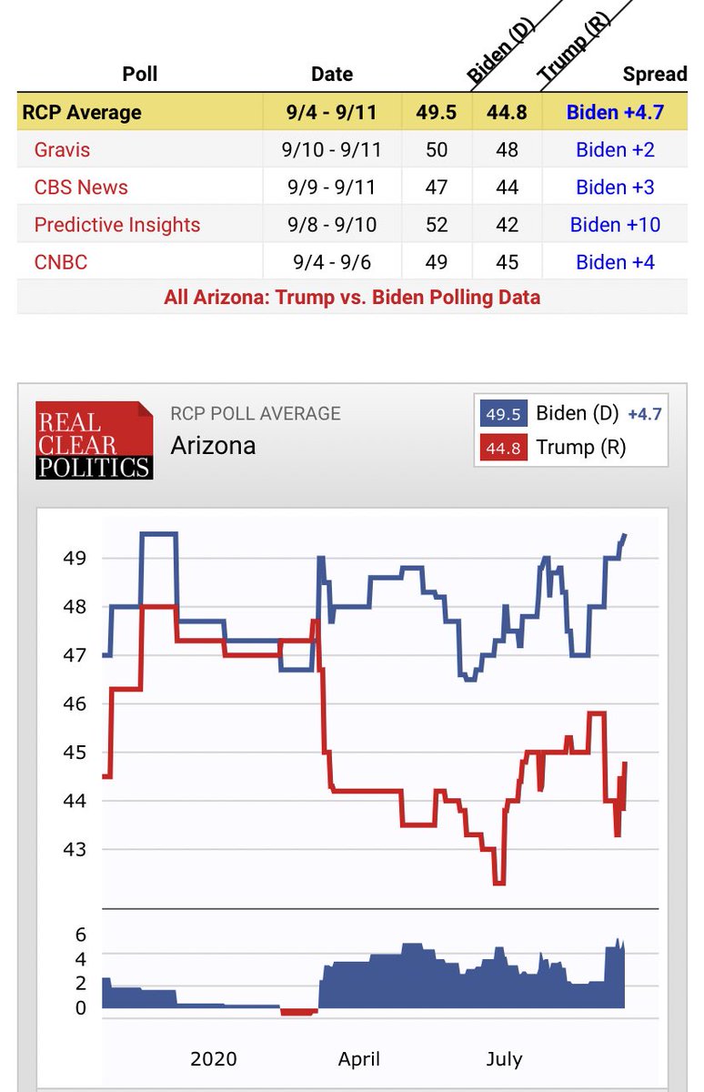ارتفاع بايدن في بانسلفينيا PAيقابله نزول له في ويسكانسونWi حسب اخر استطلاعين هناك متقدم فيها بهامش الخطأ،وبانسلفينيا اخر استطلاعين من واشنطن بوست ونيويورك تايمز تجعله متقدم ٩،(مبالغ فيه جدا)تقدم بايدن في PA سيكون بحوالي اربعه الى خمس نقاط وممكن اقل.