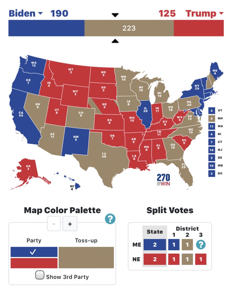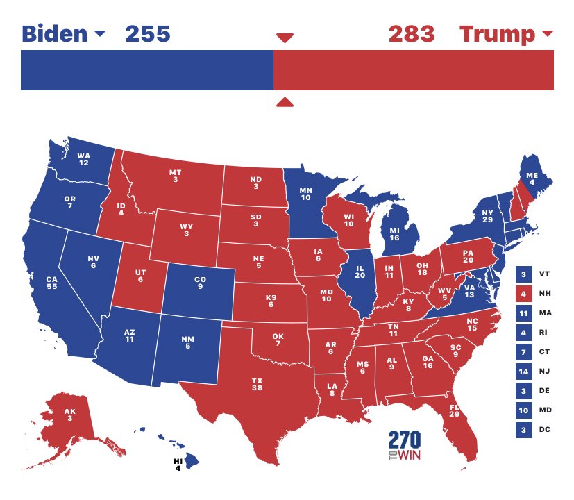 اسهل طريق للفوز لترامب وبايدن علما ان بايدن متقدم باستطلاعات الرأي المحدده له وغيرها من الولايات التي ليست محدده،.وترامب متأخر بولايتين من المحدده له،. بمعنى حتى الان بايدن طريقه اسهل واكبر للفوز من ترامب #الانتخابات_الامريكيه #السباق_الرئاسي #امريكا #بايدن #ترامب