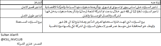 يبلغ عدد المركبات العاملة في قطاع التاجير في المملكة حسب تصريح وزير النقل في شهر مارس 300 الف مركبة و 2281 سجلا تجاريا ويبلغ حجم اسطول الشركة من السيارات الف29 سيارة للتاجير تقريبا 10% من اجمالي المركبات في القطاع مما يدل على ان الشركة تعتبر من رواد القطاع