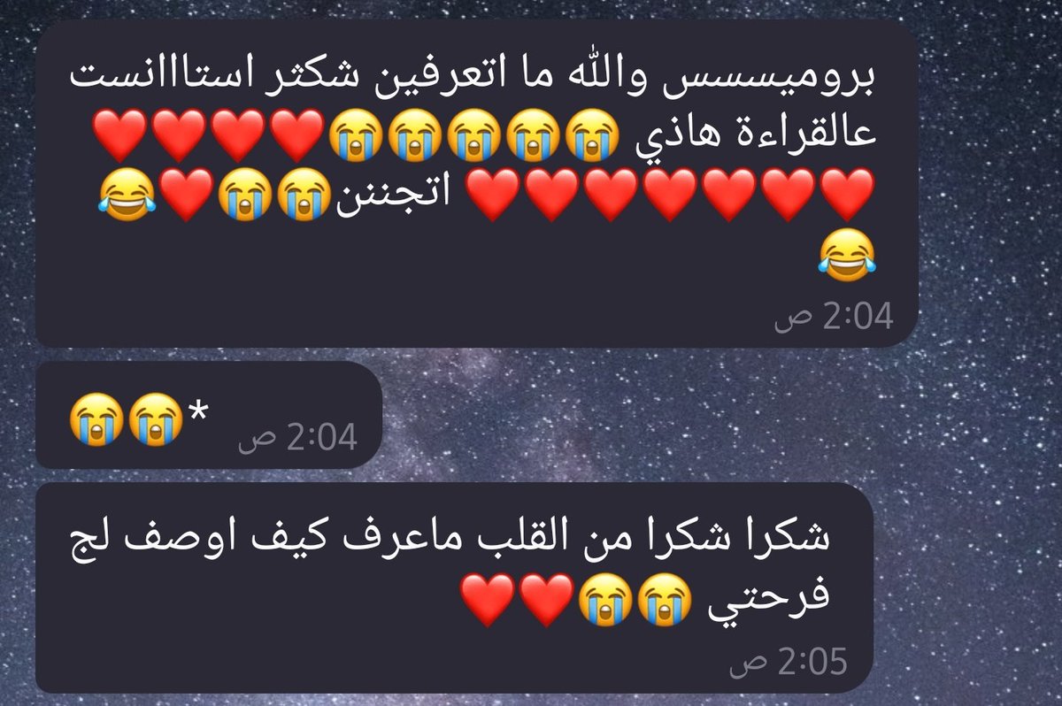 ياحلوين اللي حجزت عندي قراءة أو تعاملت معاي بفعالية أو فارت بمسابقة لطفاً تحط تجربتها هنا سواء إيجابية أو سلبية وشكراً 💛💫