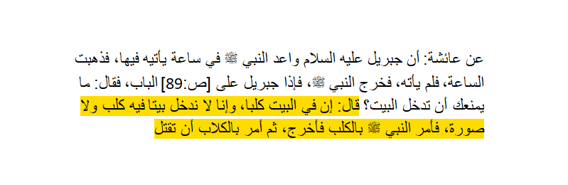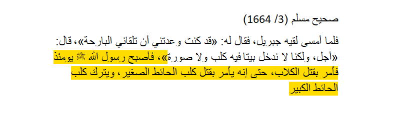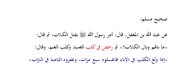 ( من اقتنى كلباً إلا كلبا صائدا أو كلب ماشية نقص من عمله قيراط، وقيراط مثل أحد ).