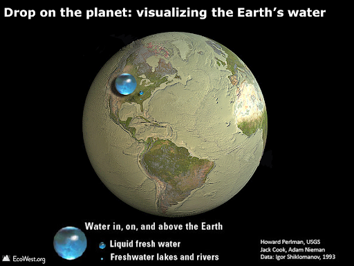 لدينا في العالم إذن 100 ألف كلم3 من المياه وهي قد تبدو كمية وفيرة بالنسبة لـ 7 مليار نسمة