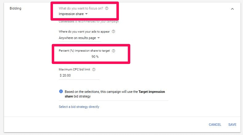 مثلا: اذا كنت تريد السيطرة على مرات الظهور في محرك جوجل.. من خلال كلمات رئيسية فيمكنك الظهور بنسبة 100% بتحديد 100% كنسبة ظهور مستهدفة!