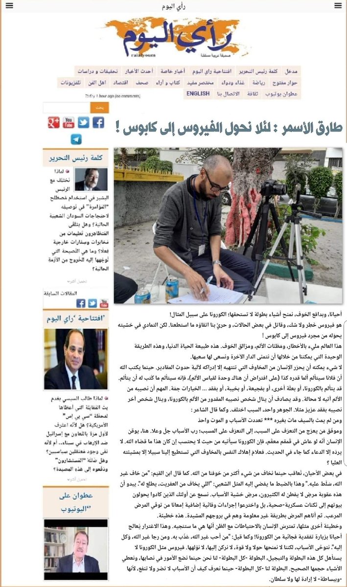ينتحل طارق الأسمر مقالا للدكتور علي الدين هلال منشور في موقع "العين" الإخباري في 2 إبريل 2020: