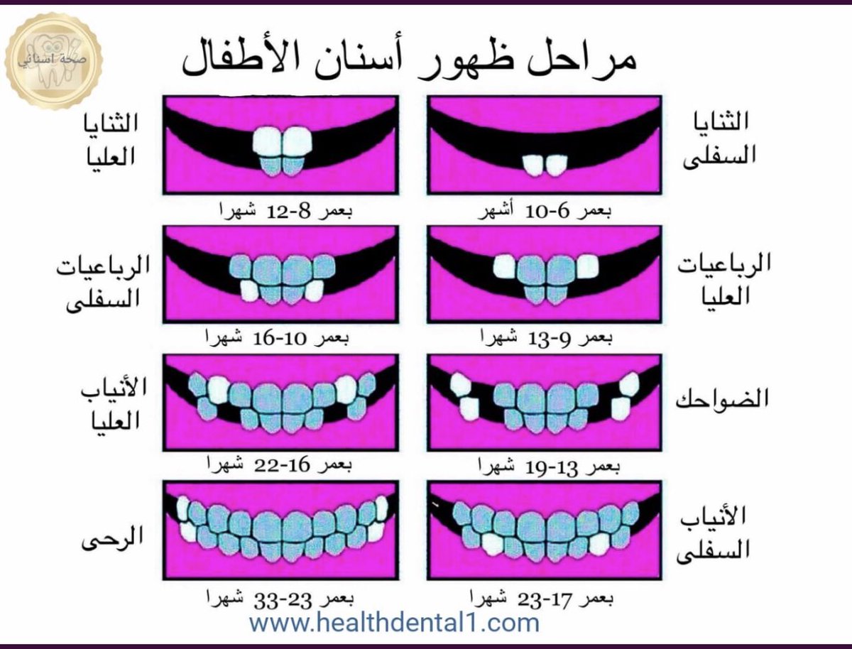 -تبدأ عملية التسنين ما بين ستة إلى تسعة أشهر من عمر الطفل، وقد يختلف وقت التسنين من طفل إلى آخر، فمن الممكن أن تبدأ مرحلة التسنين قبل ذلك العمر (٤-٥ شهور) أو بعده(٩-١٢ شهر)