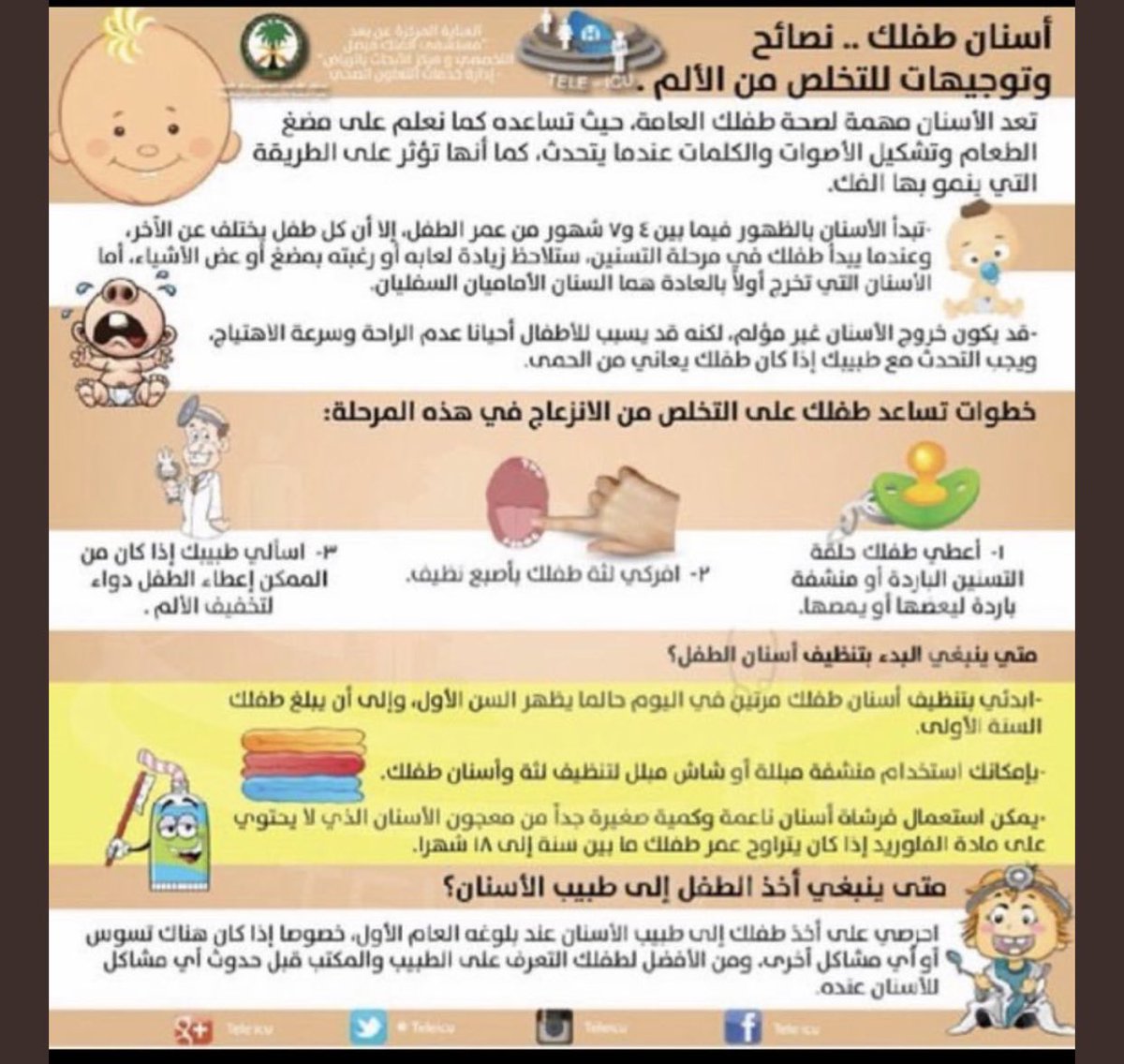 -في حال تأخر ظهور الأسنان بعد عمر ١٢ شهر يفضل مراجعة الطبيب لعمل أشعة على فك الطفل، للتأكد من وجود خنادق الأسنان، وأنها فقط تحتاج بعضًا من الوقت ، ولعمل تحليل دم مستوى الكالسيوم و فيتامين D