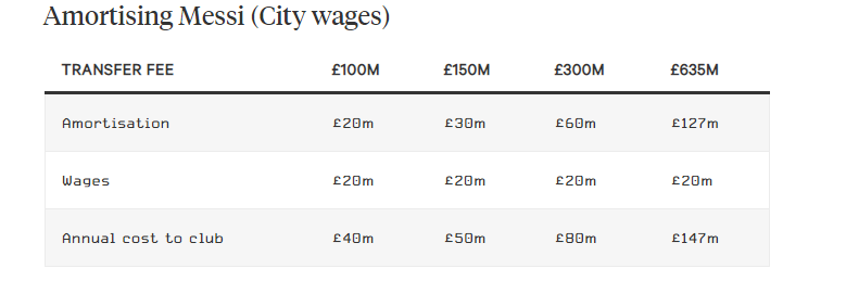 حتى لو كانت هذه المدخرات على ستة أو سبعة لاعبين لا تغطي تكلفة أربعة لاعبين جدد بما في ذلك ميسي ، فهناك مساحة كبيرة للمناورة - بالنسبة للفترة المشمولة بالتقارير ذات الصلة 2016-19 ، حقق السيتي ربحًا بقيمة 107 مليون ويتيح لهم برنامج الغذاء مقابل الغذاء خسارة 26.8 فقط