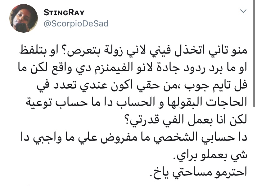 ما عندي أي مشكلة مع أي زول بدافع عن حقوق أي فئة مضطهدة.. وانا بدافع معاك برضو، طول ما احنا بنطرح قضيتنا بي إحترام وبنتناقش بي احترام بدون اهانة لي أي طرف تاني. فما عايز الناس تفهم انه انا مشكلتي مع فئة معينة.