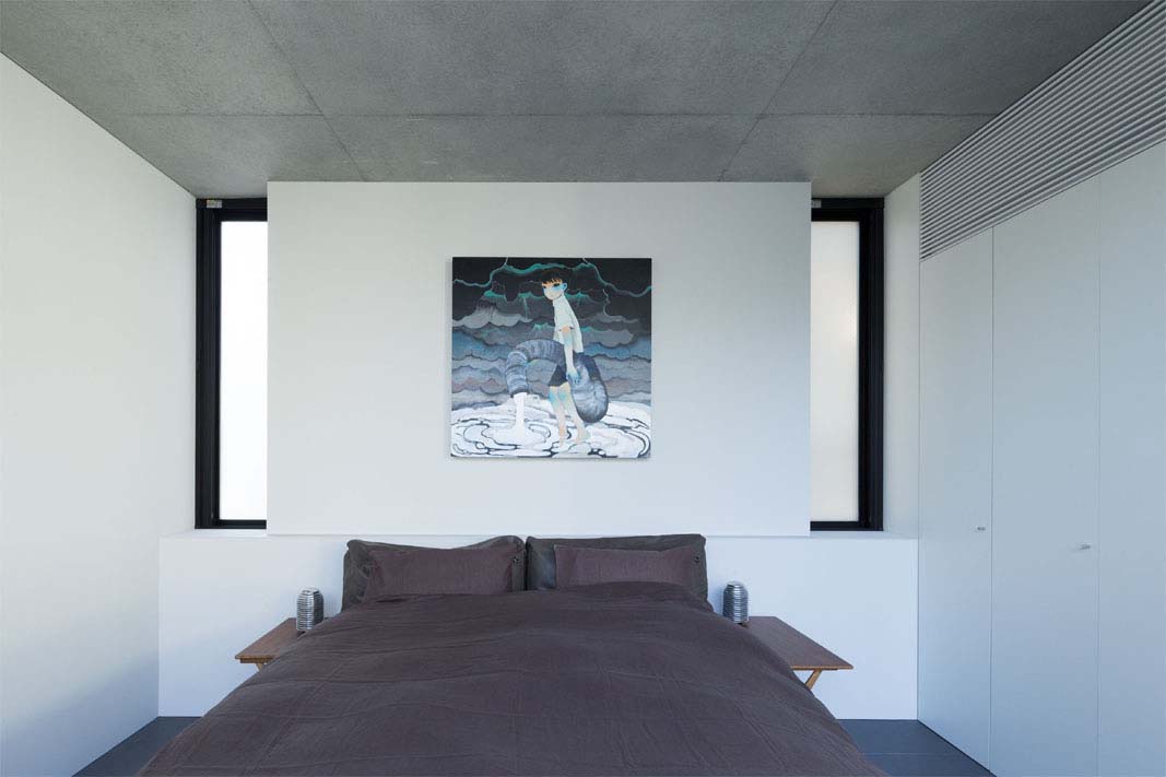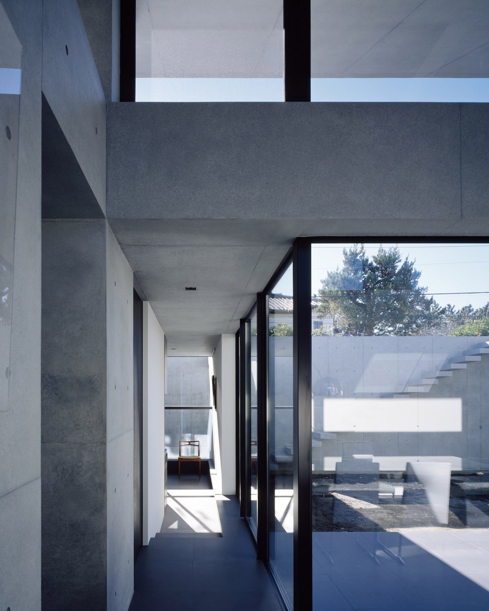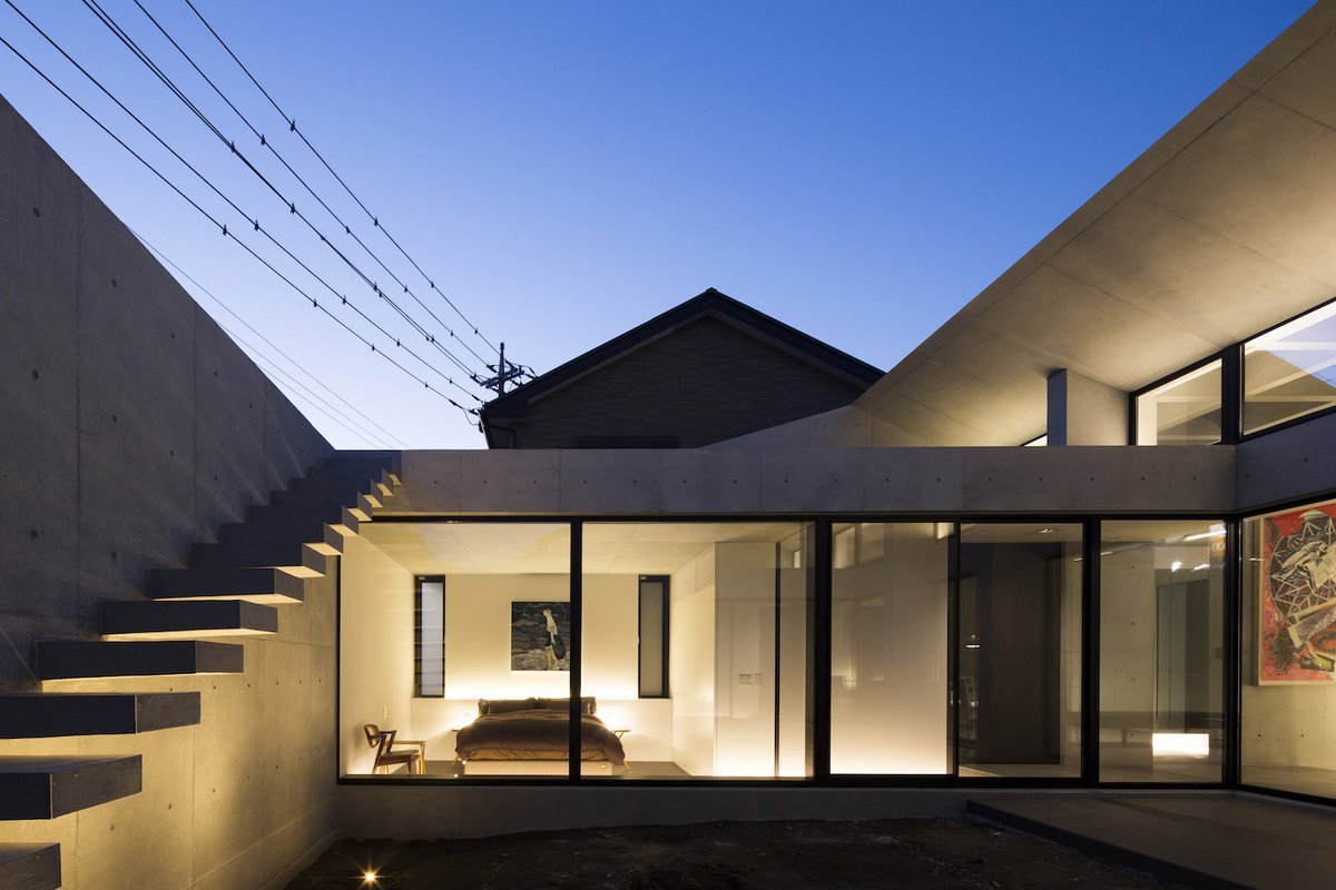 واجهة هذا المنزل مصمته , زجاج علوي يدخل الإضاءة ويحقق الخصوصية يسكر الرتابة مع وتكوين غير اعتيادي ,
