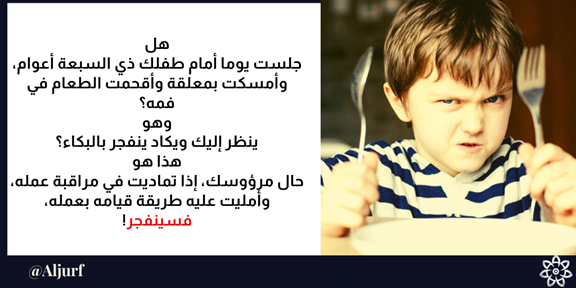 على مكتبه، وحين سأله زميله عن السبب أجاب: أعمل على 6 مهام يوميا، ويخرج مديرى من مكتبه ليجلس بجانبى 6 مرات، يخبرني فيها ماذا أفعل وكيف أفعله. لا يفوته شيء، حتى النقطة آخر السطر يخبرني أين أضعها بالضبط.