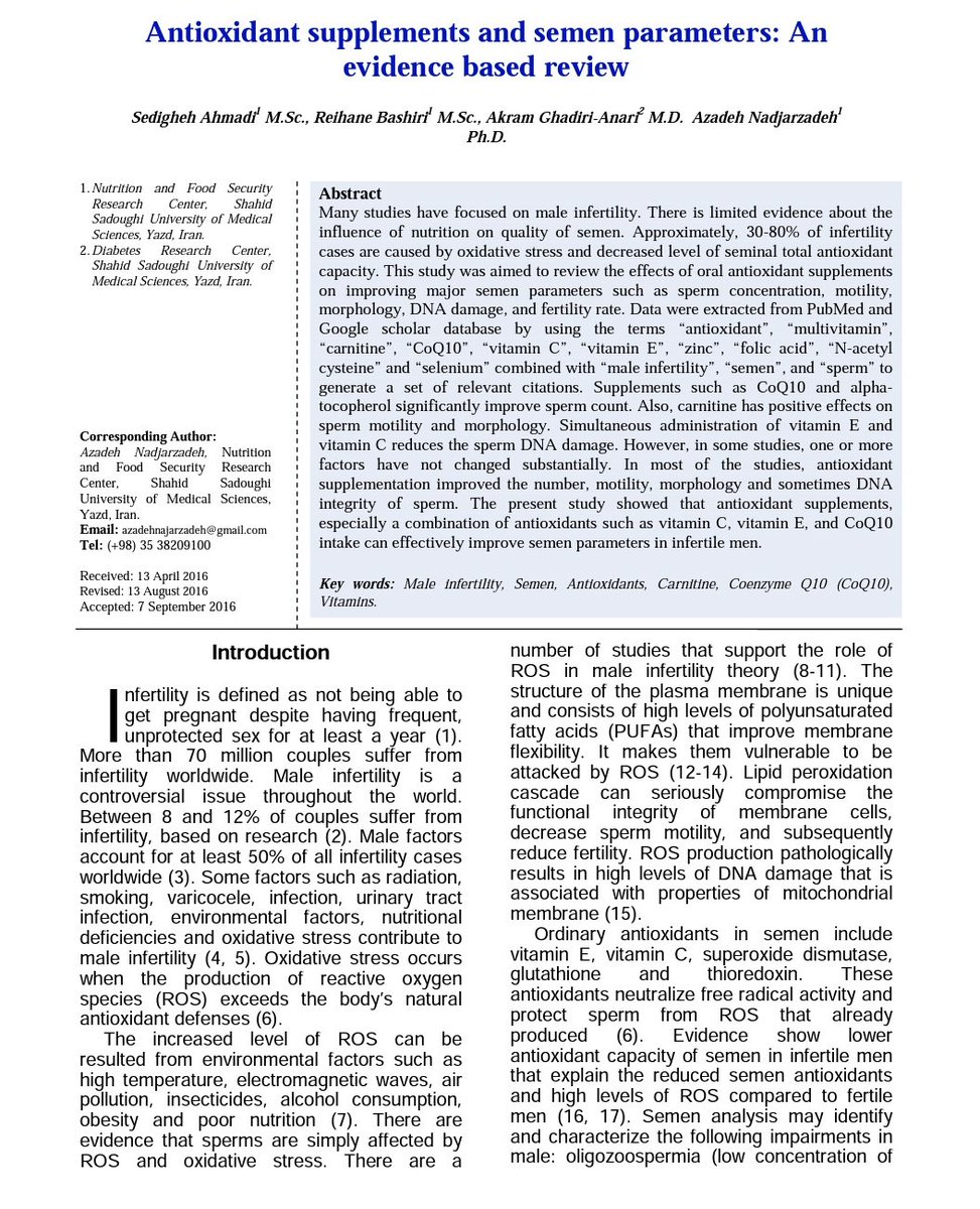 🛑تأكسد السائل المنوي يسبب نقص في حركة وعدد الحيوانات المنوية وايضا تكسر للحمض النووي في مايقاري ٣٠ الى ٨٠% من حالات عدم الانجاب.