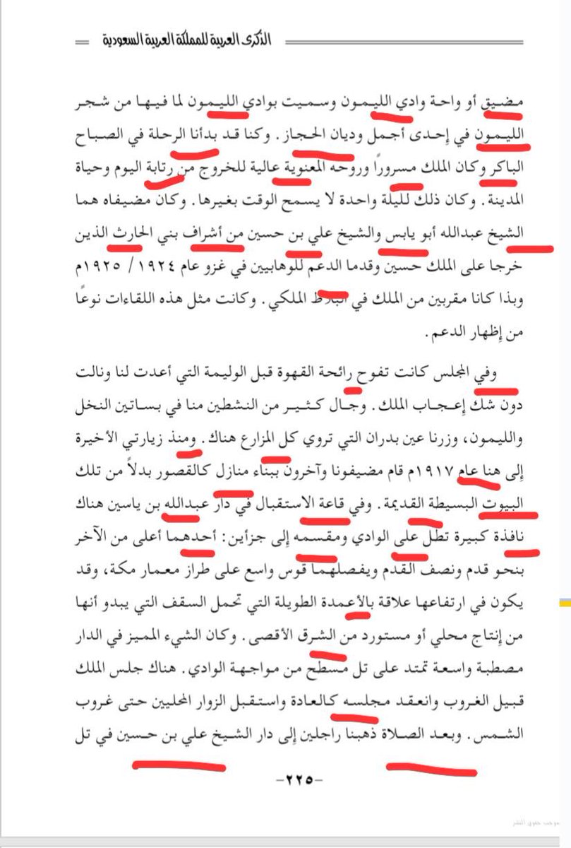 على سبيل ،،،المثال ،،،وصف عبدالله فلبي،،،لوادى المضيق ودهشته،،،لانتاج الحمضيات الوفير،،عندما زاره،،فى ضيافة #الأشراف_الحرث ،،واستنزاف المياة من أجل نقلها للمدن ادت الى خلق مشكلة كبيرة