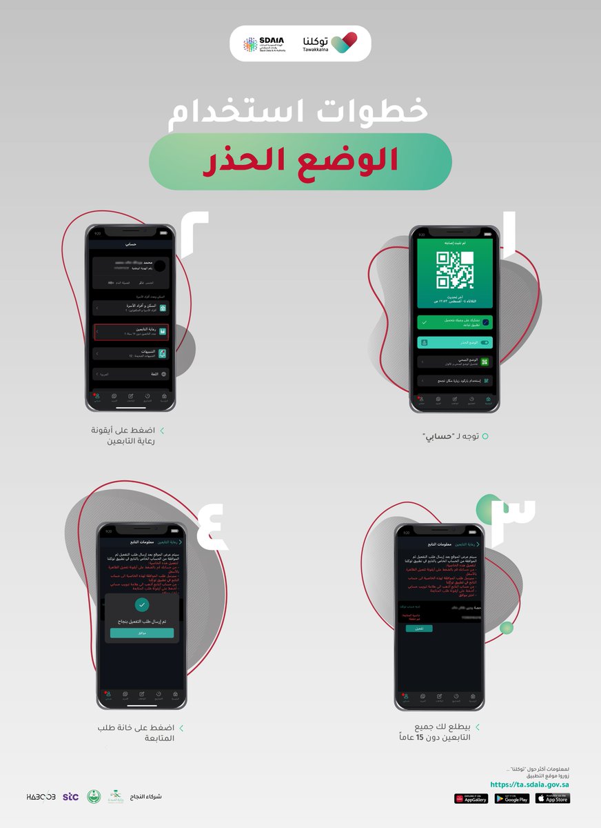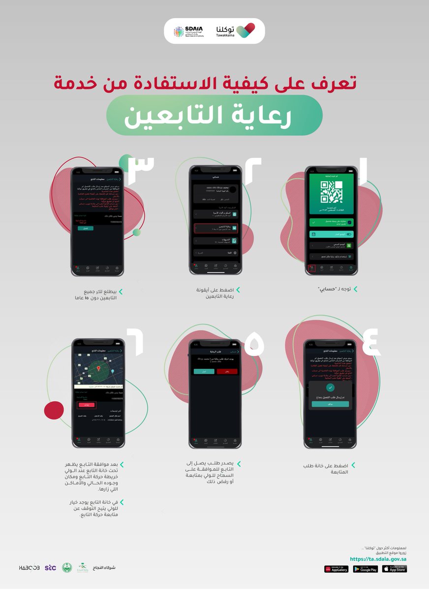 #تطبيق_توكلنا يطلق خدمة رعاية التابعين اللي توفر لكِ إمكانية متابعة أطفالك اللي أعمارهم تحت ١٥ سنة -بعد موافقتهم-، لحمايتهم من أي مكروه لا قدر الله. تعرفي على الكيفية في الانفوقرافيك التالي👍🏼