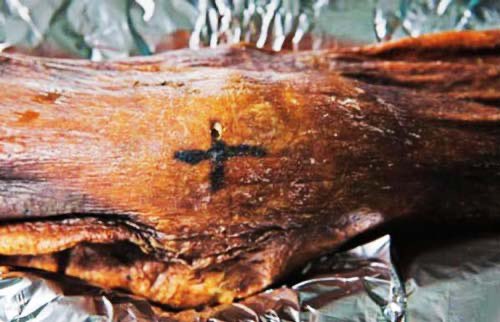 احد الأوشام الغامضة هو وشم صليب موجود على ركبته اليمنى , قد تكون مصادفه لا أكثر , لكن ما اذهل العلماء والباحثين عبر أنحاء العالم هو أن تحتفظ هذه الوشوم بوضوحها طوال أكثر من 5000 عام , ولم تعرف المادة المستعملة لرسم هذه الوشوم , اعتقد العلماء انه الكربون ولكن لم يستطيعوا