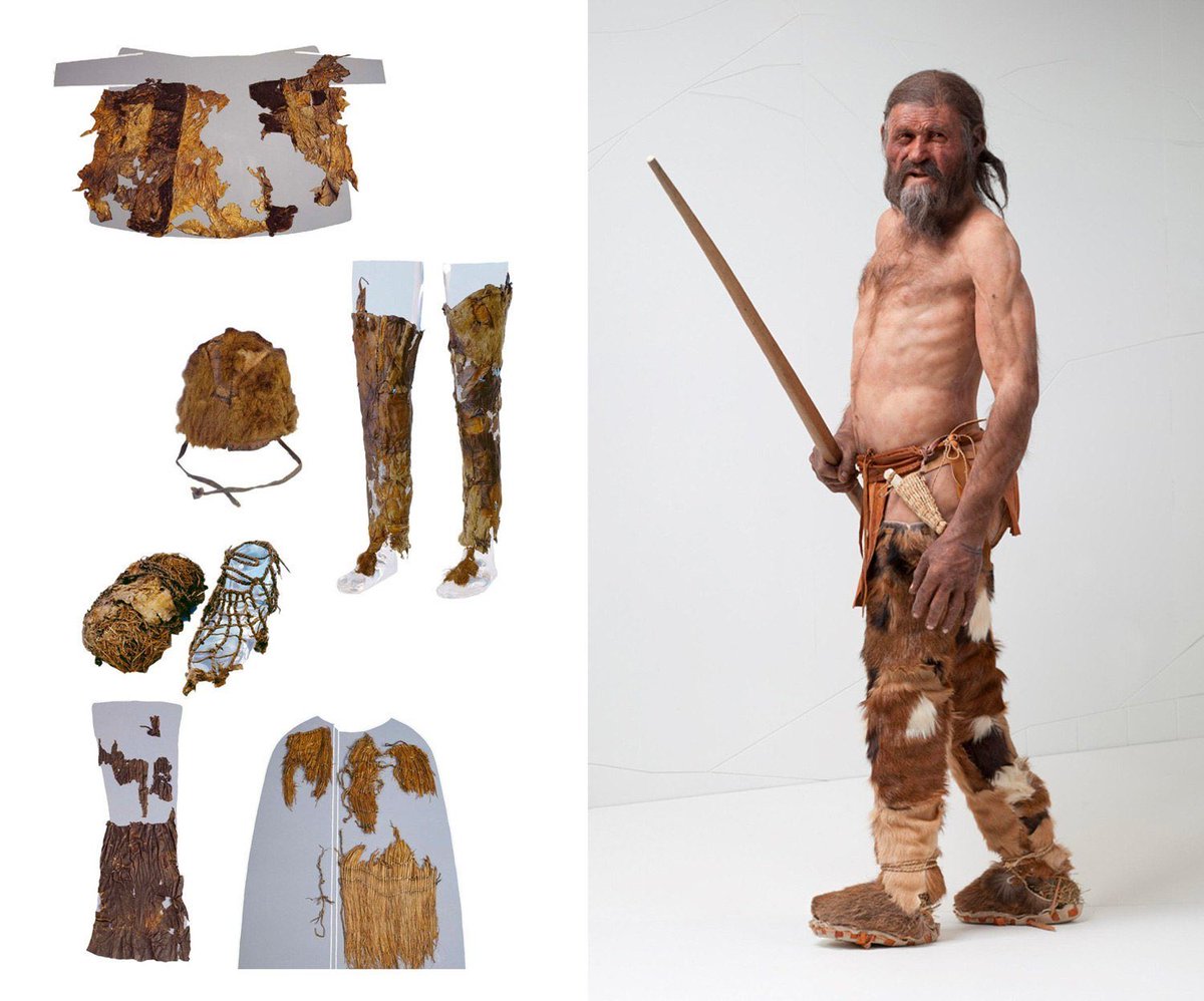 وتم العثور أيضا على حقيبة فيها فطر وأعشاب طبية وأدوات مثل سكين وطبق ومقشطة تستعمل لسن السكاكين والسهام , ووجد بجانبه أيضا على فأس مصنوع من النحاس النقي بنسبة أكثر من 90 في المئة , ووجد معه 14 سهما في حالة جيدة .