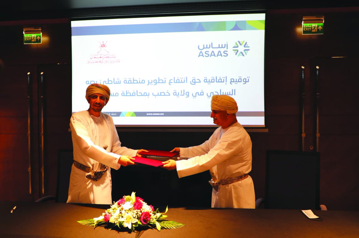 شركة مسقط الوطنية للتطوير والاستثمار /أساس/ توقع اتفاقية حق انتفاع مع مكتب وزير الدولة ومحافظ مسندم لتطوير موقع شاطئ بصه السياحي في ولاية خصب بـ #محافظة_مسندم بتكلفة نحو 9 ملايين ريال عماني.