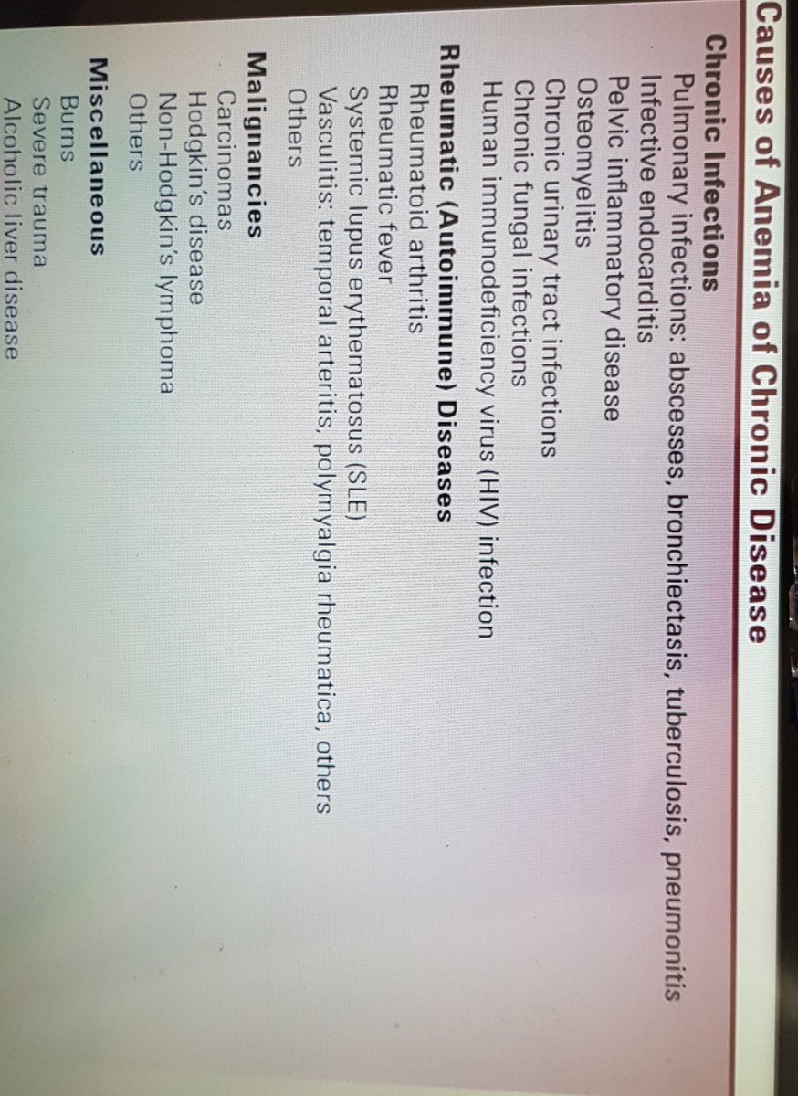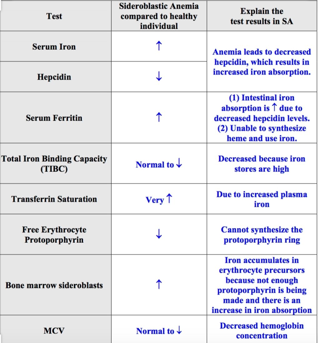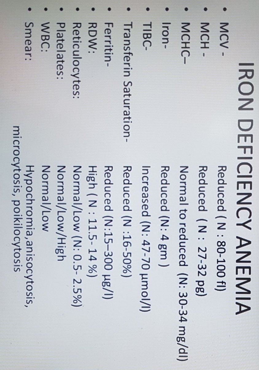 الحديد عنصر مهم في تكوين الهيموقلوبين، فنقصانه يؤدي الى نقصان إنتاج الهيموقلوبين بالتالي تنتج خلايا حمراء بحجم صغير بصِبغة ناقصه (hypochromic)، من أعراضه التعب والإعياء، أضافر هشه او على شكل ملعقه، التهاب اللسان و الرغبه في تناول مواد غير غذائية.