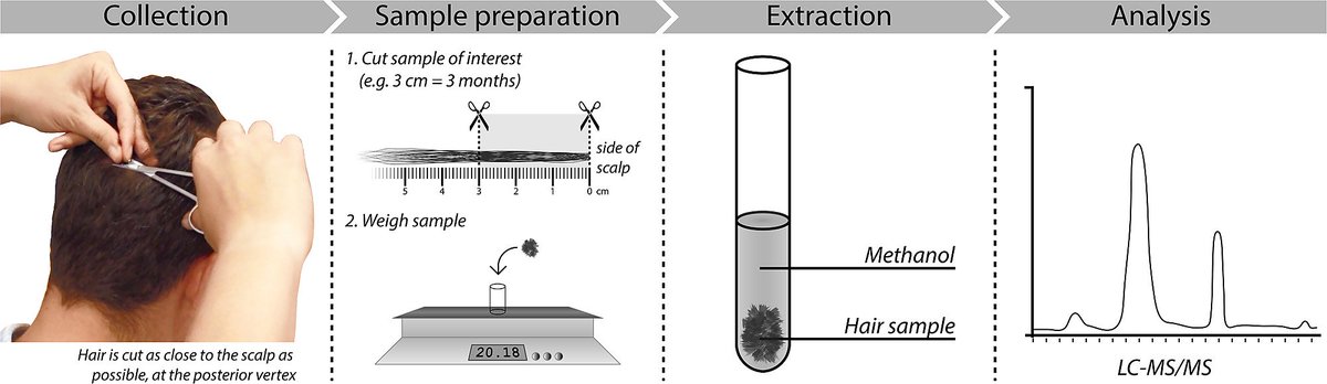 ولا بد من مراعاة أن كشف المستقلبات metabolites في الشعر قد يكون مفيدًا من أجل التمييز بين التلوث الخارجي والتناول، وقد تقدم النتيجة الإيجابية لتحليل عينة الشعر دليلاً على تناول عقار خلال فترة نمو عينة الشعر الخاضعة للتحليل