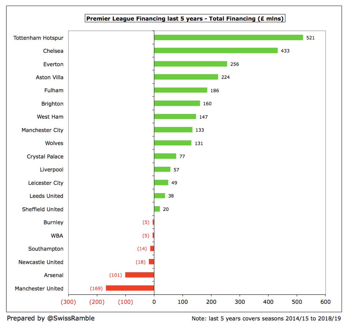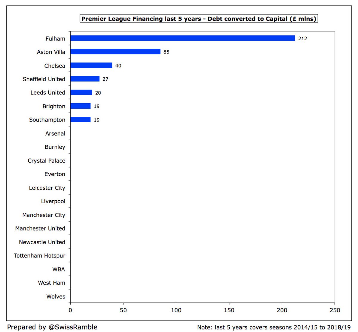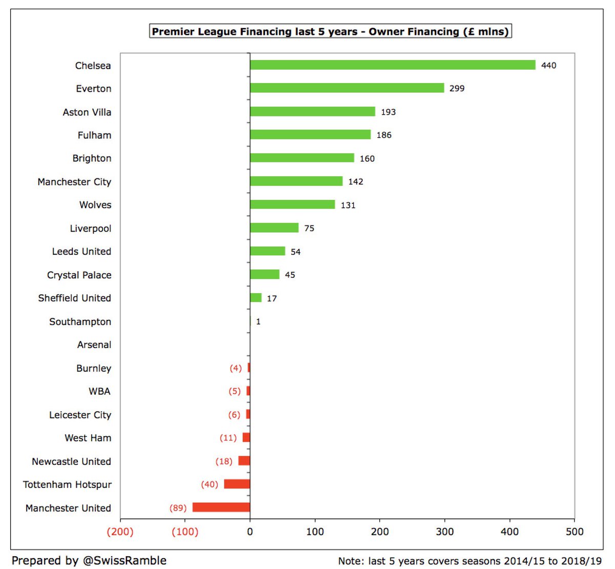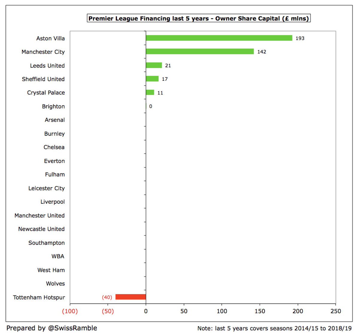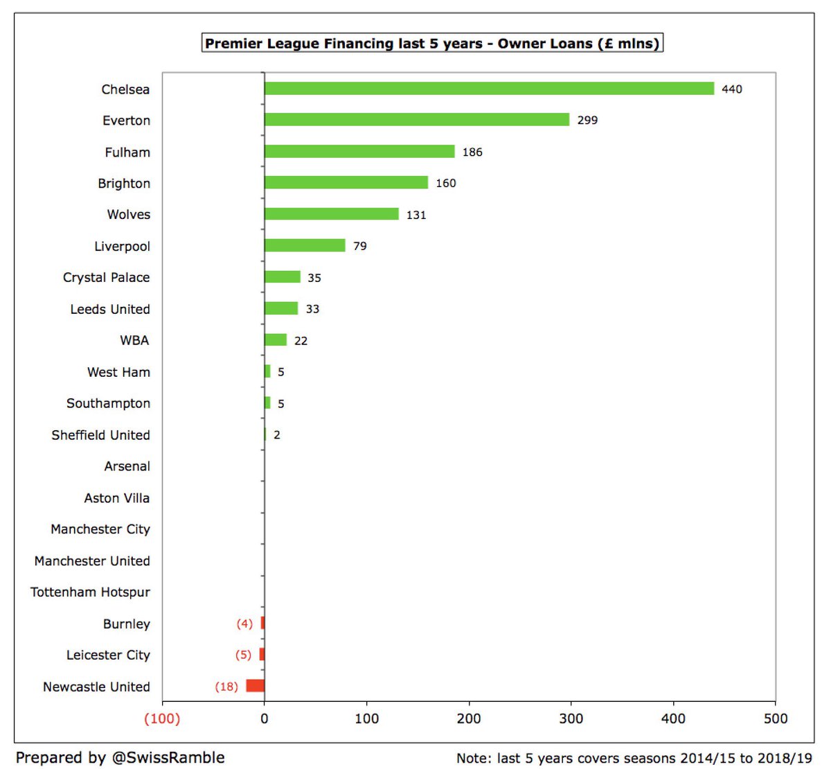 ٧ أندية فقط استفادت من ملاكها أكثر من ١٠٠مليون£ في السنوات الخمسة وتصدر هذه الاندية تشيلسي بهذا الرقم الكبير