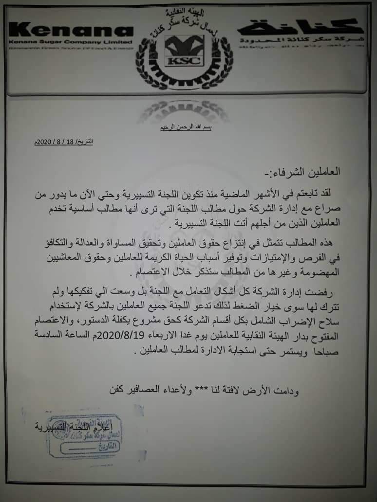 في 18 اغسطس 2020 وبعد ان يئست اللجنة التيسيرية من التواصل مع ادارة الشركة لم يكن امامهم الا اعلان الاضراب العام والاعتصام حتي تتحقق المطالب