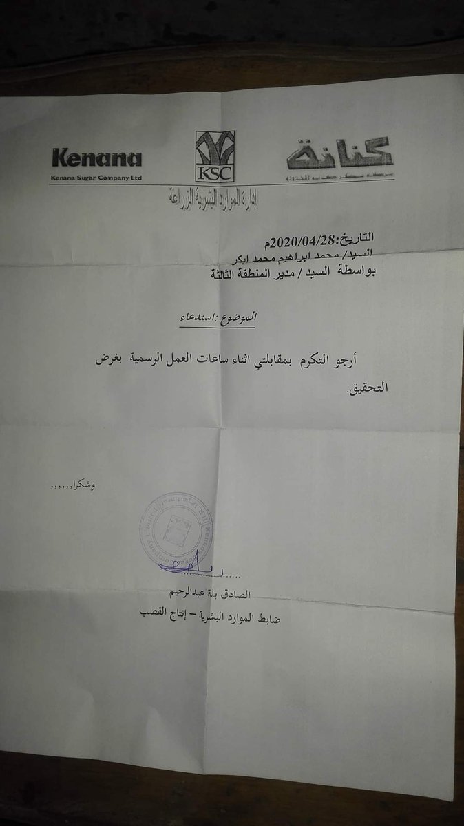 استمرت المضايقات لقادة العمال عبر الموارد البشرية بالتهديد والترهيب والخصم. مرفق نموذج لخطاب ل محمد ابراهيم الناطق باسم اللجنة التسيرية