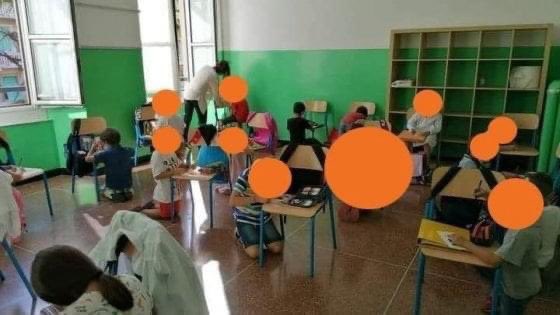 أمس عاد الأطفال الإيطاليون إلى المدرسة، وُفرت لهم القناع، لكن نقصت المقاعد. وكما نرى، معظم الأطفال حضروا دروسهم على ركبهم.