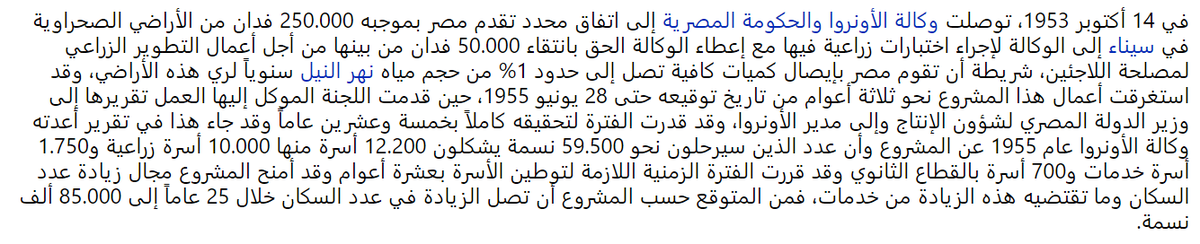 14 أكتوبر 1953: توصل جون بلانفورد ، رئيس الأونروا والحكومة المصرية لاتفاق تقدم مصر بموجبه ربع مليون فدان بشمال شرق سيناء، ومقدار 1% من الإيراد السنوي للنيل، لتقوم الأونروا باستصلاح خمس المساحة لتوطين 60,000 فلسطيني.