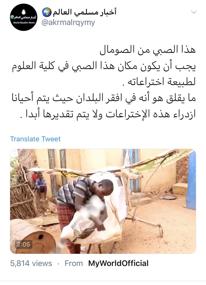 ربط مخترع واعد جوليد أدم بصورة نمطية تعشش في عقولكم الفقيرة هي مأساة، سؤالي ما هو هذا الفقر الذي تهربون منه/ الخبر عن شاب بدوي حلق في السماء بعقله إلى إسطنبول/ قدرنا الرد على بنوك مغردة لا أدب لها/ نقطة أخيرة حقوق الطبع محفوظة للمتجولين بالكاميرات فلا تسرقوا الجهود #الصومال