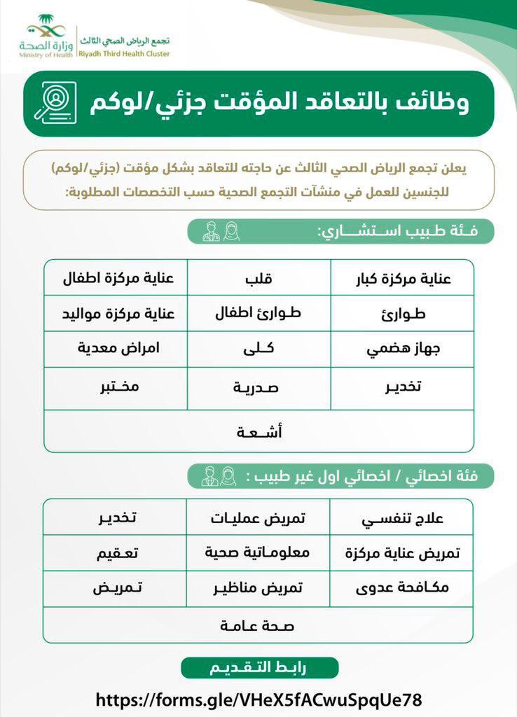 أعلن التجمع الصحي الثالث عن حاجته للتعاقد بشكل مؤقت (جزئي/لوكم) لفئة طبيب استشاري وفئة اخصائي "غير طبيب" في عدد من التخصصات الصحية👨🏻⚕️✨👩🏻⚕️