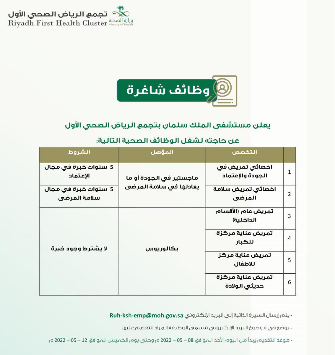 أعلن مستشفى الملك سلمان بالتجمع الصحي الأول بمدينة الرياض عن توفر عدد من الوظائف في مجال #التمريض حيث أن بعضها لايشترط وجود خبره للمتقدم 🎓