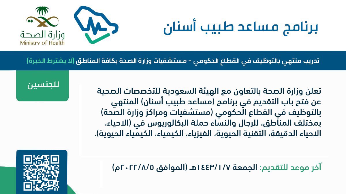 أعلنت وزارة #الصحة عن توفر عدد 2221 وظيفة "أخصائي غير طبيب" للجنسين لعدة تخصصات صحية حيث يبدأ التقديم اليوم الخميس ولمدة عشرة أيام 👨🏻⚕️✨👩🏻⚕️